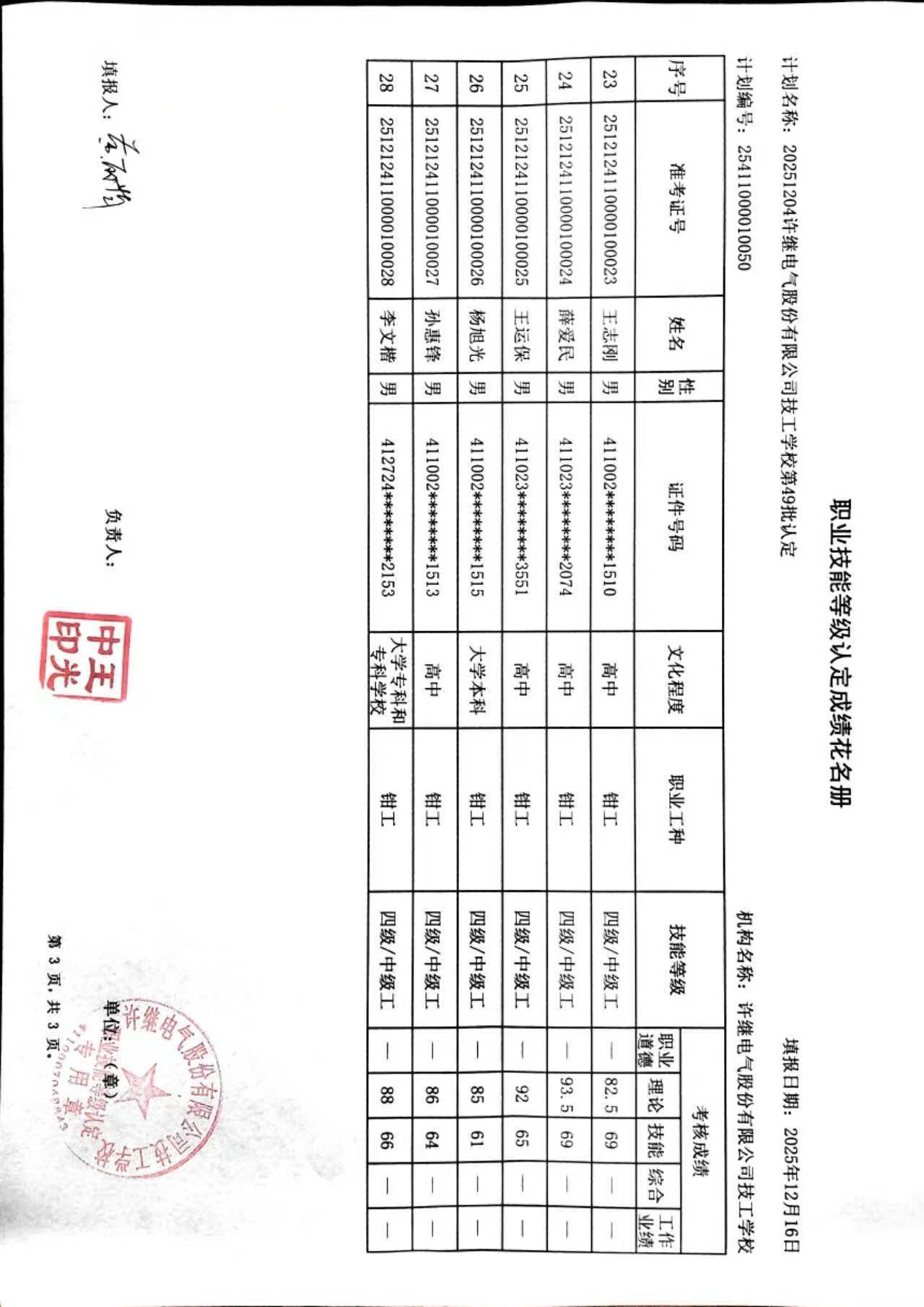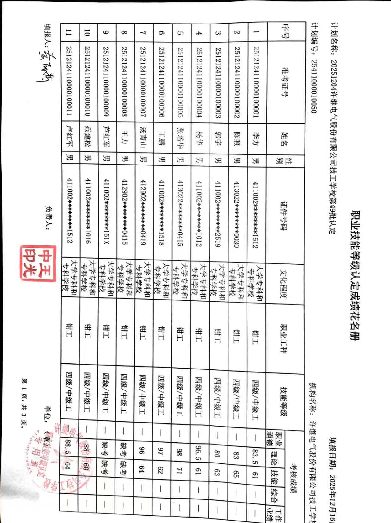 许继技工学校2025年第49批社会化职业技能等级认定成绩公示
