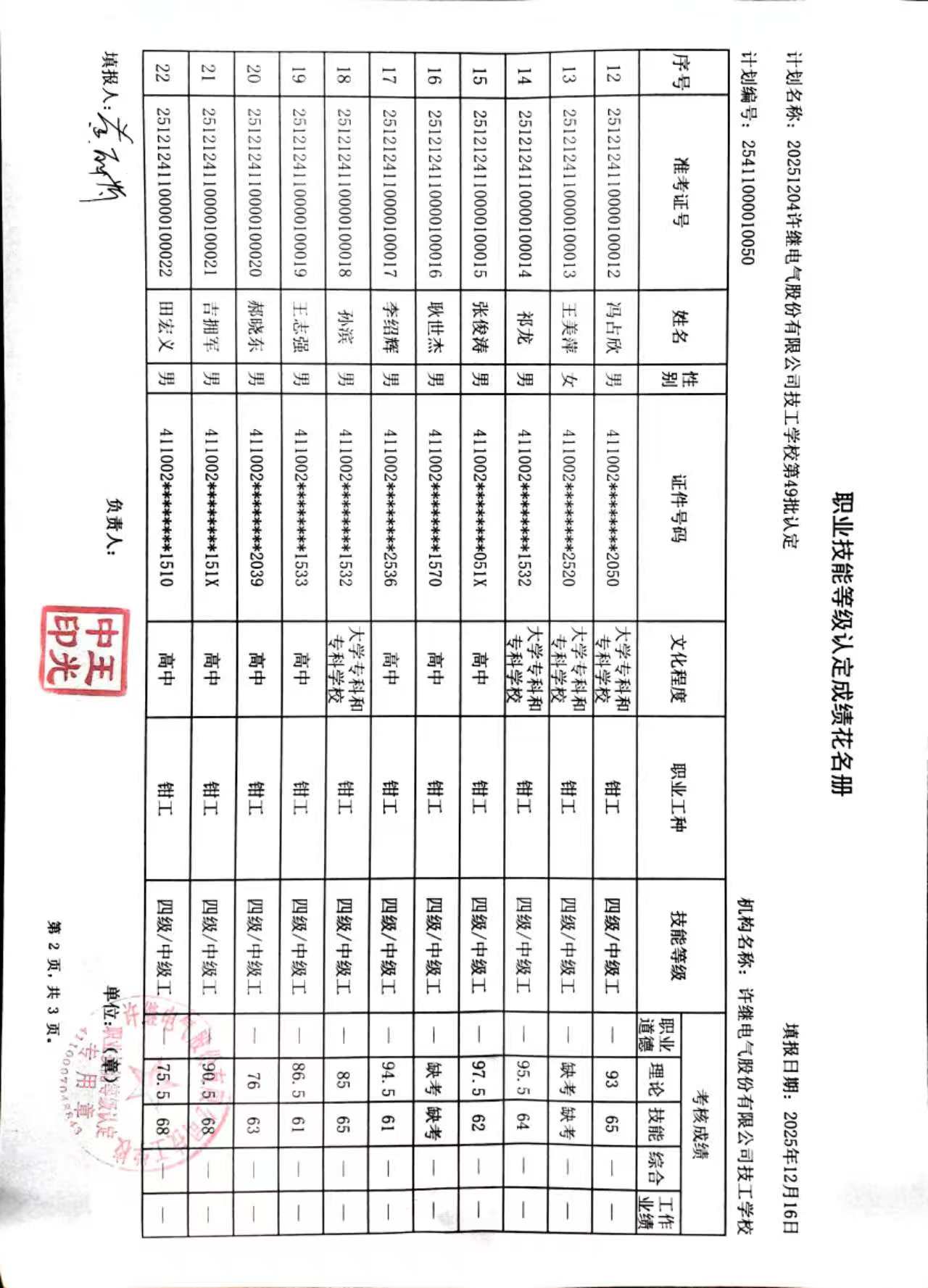 根据《许继技工学校职业技能等级认定工作流程》的文件要求,为确保职业技能等级认定的公平公正,现面向社会对我校2025年第49批社会化职业技能等级认定成绩进行公示,公示期:12月16日——12月22日。