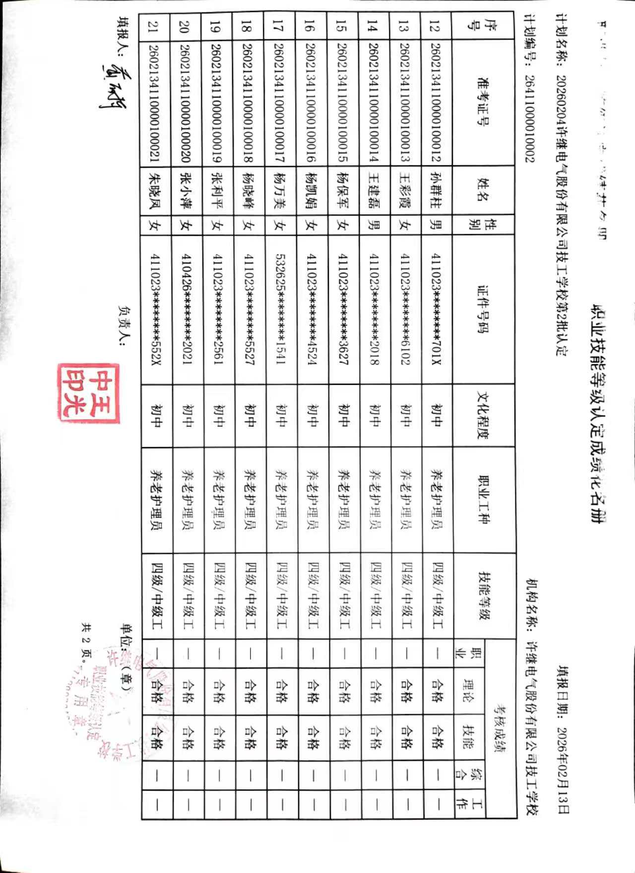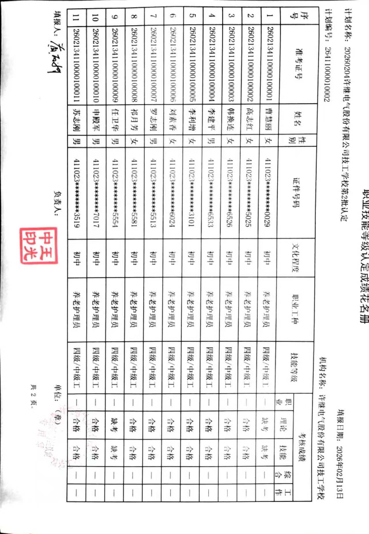 许继技工学校2026年第2批社会化职业技能等级认定成绩公示