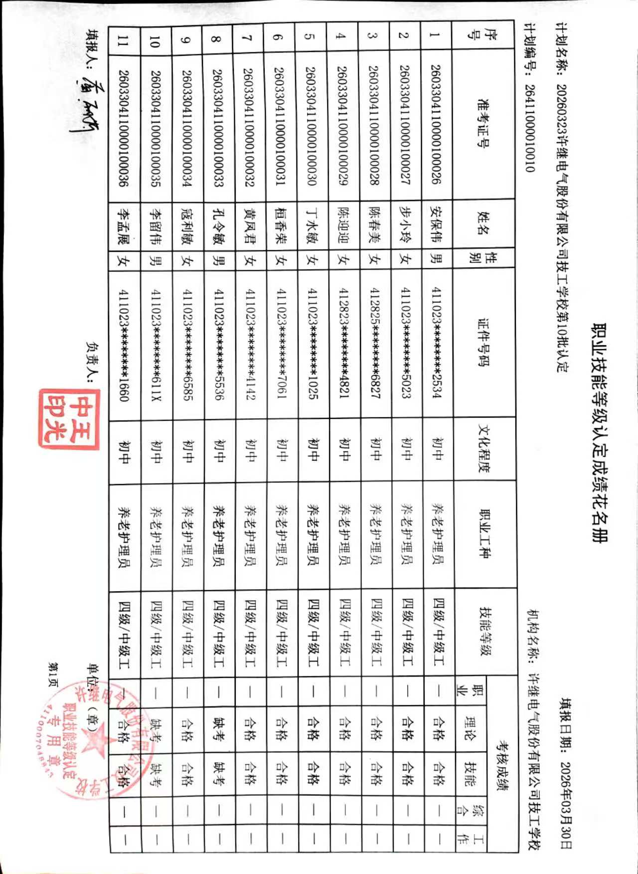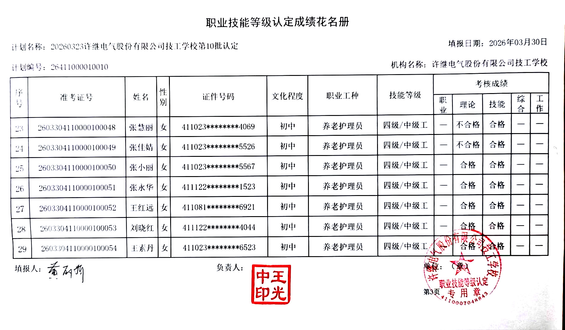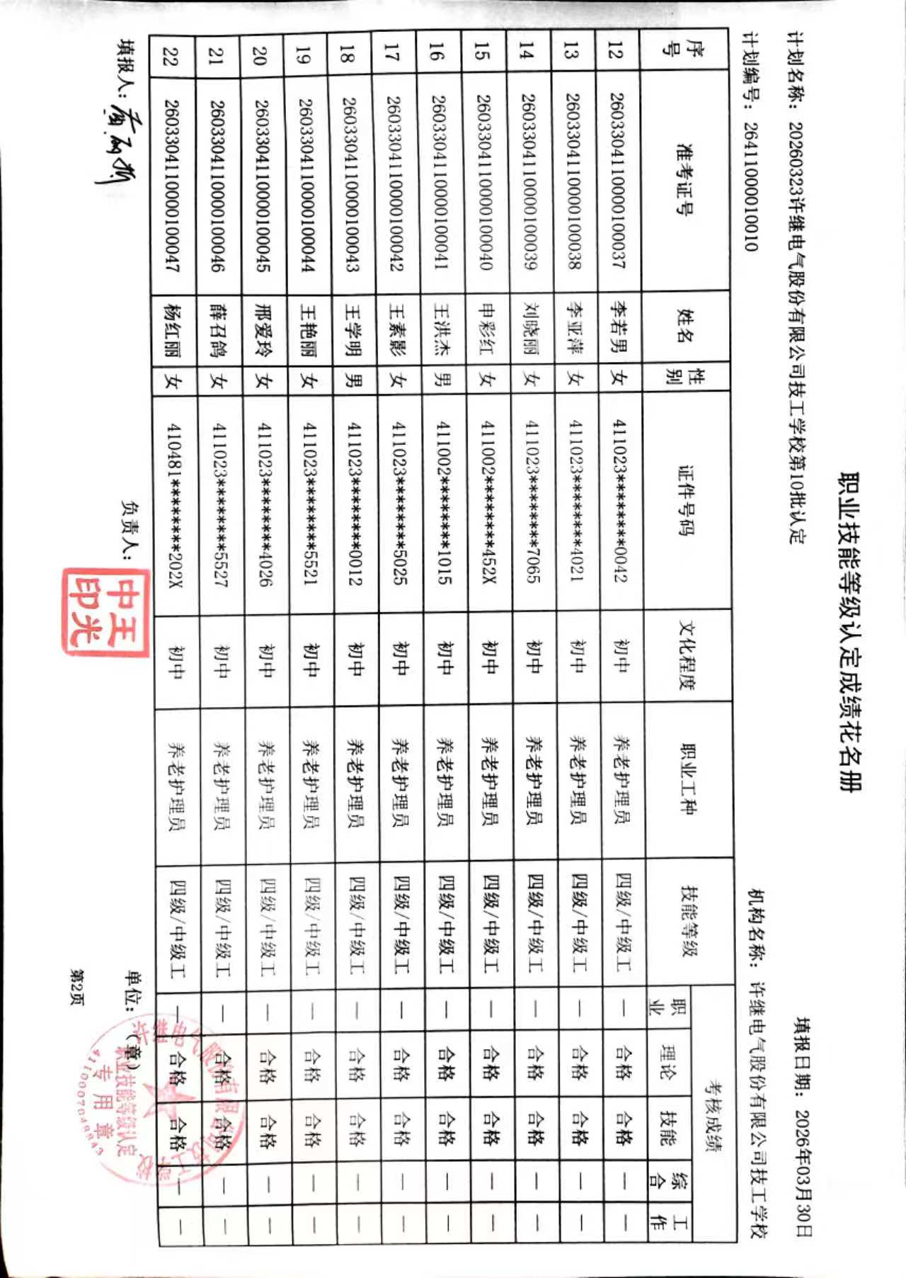 许继技工学校2026年第10批社会化职业技能等级认定成绩公示
